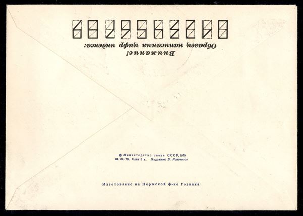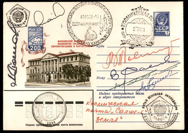 1981 - stazione orbitale Salyut-6 - cosmogramma del volo Soyuz T-4 (12.3.81-26.5.81) - bollo pentagonale nero di bordo Salyut-6, timbro ufficiale di bordo nero "Posta spaziale bordo Salyut-6 27.03.81" timbro circolare nero rumeno "Cosmodromo Baikonur maggio 81", timbro circolare pentagonale privato dei cosmonauti "La quinta principale spedizione, Salyut-6" e timbro postale ufficiale della Mongolia "Posta Spaziale" del 26.3.1981 - firme autografe di 6 cosmonauti: V.Kovalenok e V.Savinykh (Soyuz T-4); V.Dzanibekov e J.Gourragtcha - Mongolia (Soyuz-39); L.Popov e D.Prunariu - Romania (Soyuz-40) - in rosso testo manoscritto di Kovalenok "Posta spaziale "Salyut-6" Terra" - ottima qualità