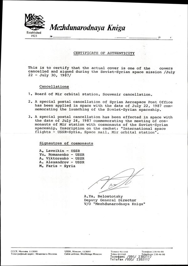 1987 - Stazione orbitale Mir - Soyuz TM-3 - cosmogramma del volo sovietico-siriano Soyuz TM-3 - bollo pentagonale nero di bordo Mir, annullo ufficiale "Siria 22.07.87", lancio, e sovietico-siriano "CC*CP 24.07.87", commemorativo dell'aggancio Mir e del carattere internazionale del volo sovietico-siriano - firme autografe di Y.Romanenko e A.Laveikin (Soyuz TM-2 a bordo della stazione), A.Viktorenko, A.Alexandrov e M.Faris, Siria (Soyuz TM-3) – ottima qualità - cert. Kniga