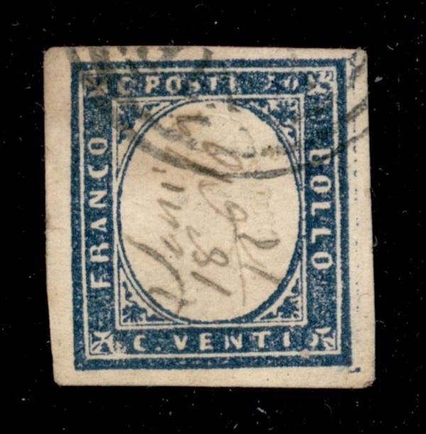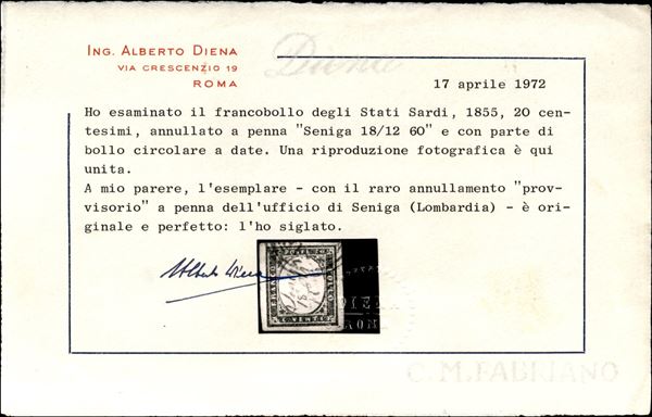 20 cent Sardegna (15C) annullato con bollo grafico Seniga 18.12.60 e parte di bollo circolare a data (P.ti 12) - raro - cert. AD