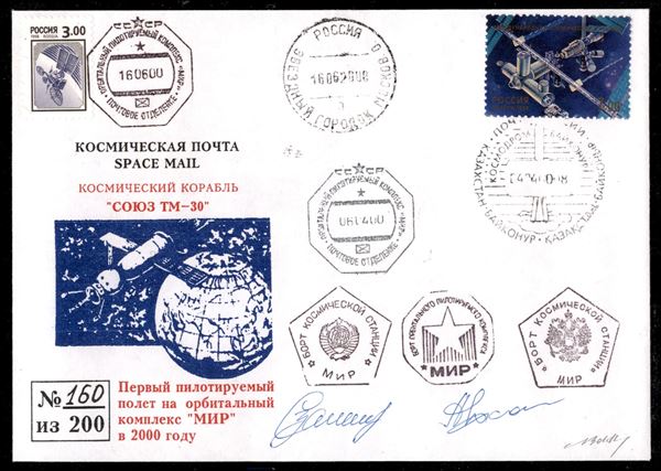 2000 - Stazione orbitale Mir - Soyuz TM-30 - Mir "2000", il primo cosmogramma del nuovo millennio in folder commemorativo - busta n.160 di 200 trasportata a bordo Mir dalla Soyuz TM- 30 - ann. di partenza dal Cosmodromo di Baikonur del 4.4.2000; ann. ottagonale "CC*CP 06.04.00", aggancio Soyuz TM-30/Mir; timbri di bordo neri, entrambi i bolli pentagonali e l'ottagonale stellare - al verso foglietto con citazione del pioniere russo Tsiolkovsky + annullo ottagonale stellare di bordo Mir - firme autografe dei cosmonauti Zaletin e Kalery - cert di autenticità del comandante Zaletin + cert. Finanziario Bolaffi 100%