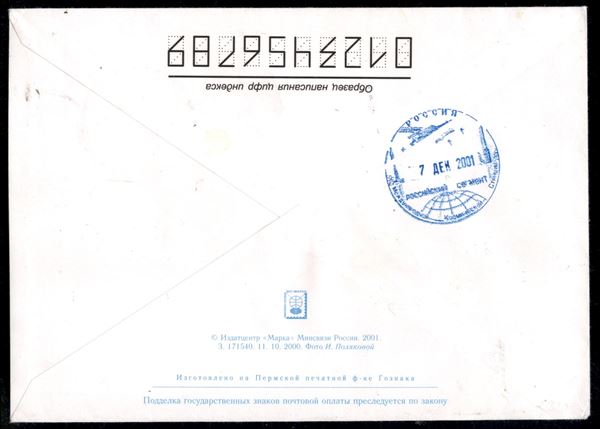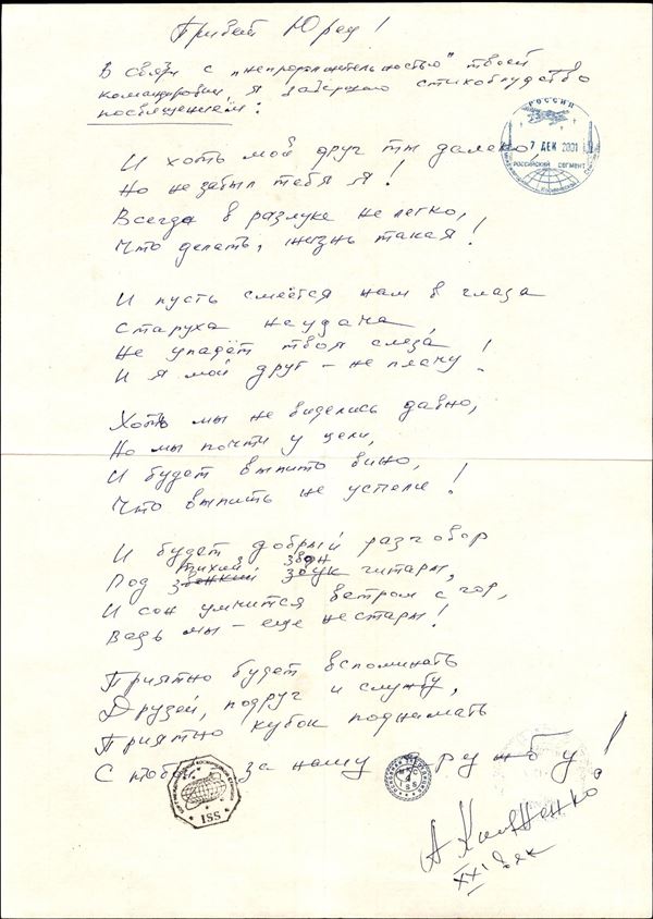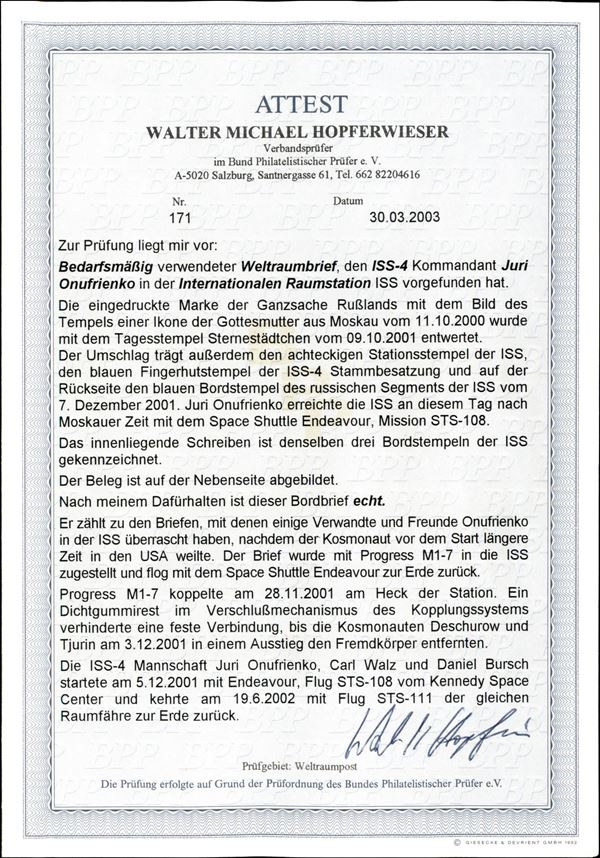 2001 - Progress M1-7/ISS/STS-108 - Spedizione 4 - Terra-Spazio-Terra - cosmogramma spedito dalla Terra alla Stazione Spaziale Internazionale a bordo della navicella di rifornimento senza equipaggio Progress Ml-7 (25 lettere trasportate) con messaggio manoscritto (poesia di Andrei Kiyanenko spedita prima e indirizzata a Y.Onufriyenko) - la lettera e il testo furono timbrati da Y.Onufriyenko al suo arrivo con l'STS-108 con il timbro personale della Spedizione 4 e con gli annulli di bordo (solo 8 di queste lettere portano la data 7.12.2001 mentre altre 17 hanno la data del 6.12.2001 orario del "Houston Control Center" e di queste 25 lettere solo 10 contengono la poesia) - la lettera ritorṇ sulla Terra a bordo dello Shutte Endeavour STS-108 il 17.12.2001 - ottima qualità e insieme di aspetti alquanto rari - cert. Hopferwieser