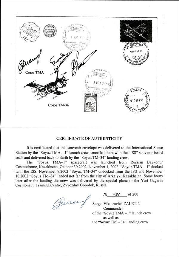 2002 - Soyuz TMA-1 - cosmogramma "Zaletin" n.191 di 200 trasportato dal volo russo-belga Soyuz TMA-1 sulla Stazione Spaziale Internazionale – annullo di partenza dal Cosmodromo di Baikonur del 30.10.2002, timbro a doppio cerchio azzurro dell'equipaggio Soyuz TMA-1 e Soyuz TM-34, due annulli rosso "Russian Segment of International Space Station", timbro ottagonale di bordo "ISS", annullo circolare della "Città delle Stelle" - al verso foglietto con citazione del pioniere russo Tsiolkovsky + timbro a doppio cerchio azzurro Soyuz TMA-l/TM-34 e timbro ovale azzurro "Odissea" - firme autografe dell'equipaggio S.Zaletin, Y.Lonchakov e il belga F.De Winne – ottima qualità - Bolaffi + cert. di autenticità del Comandante V. Zaletin