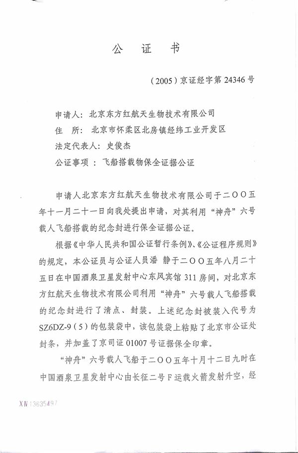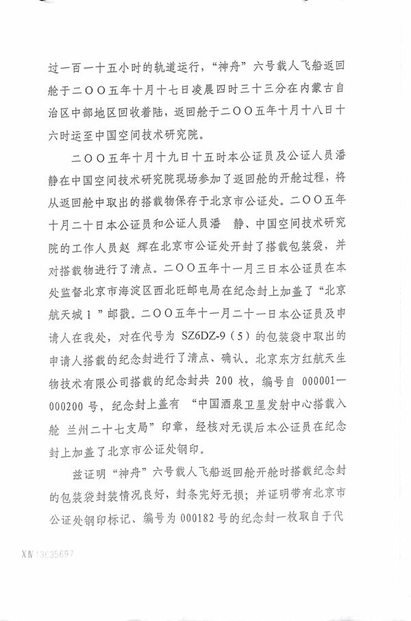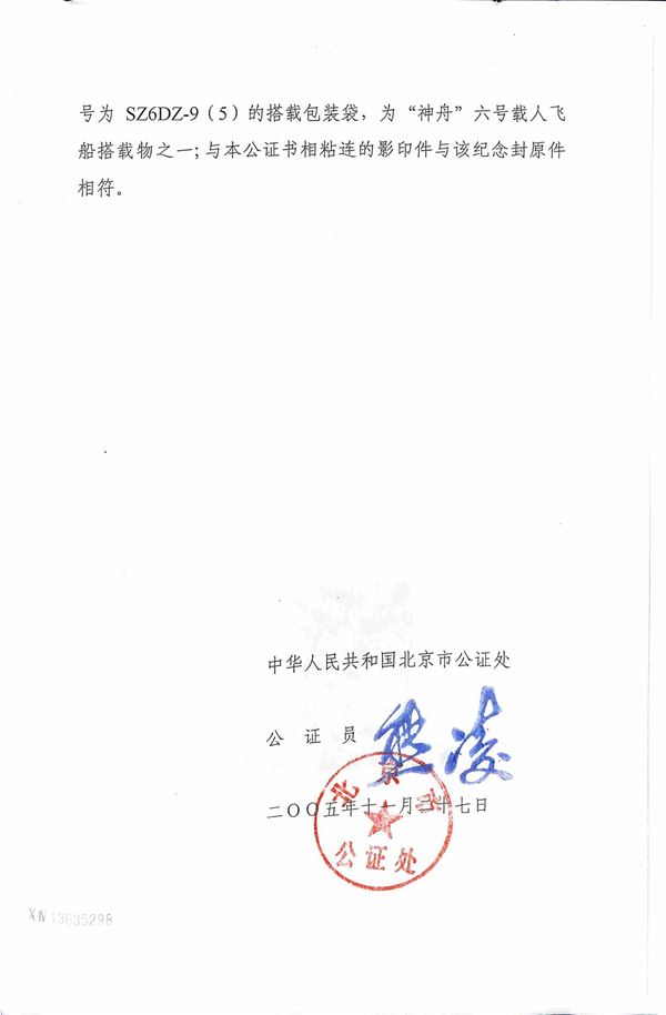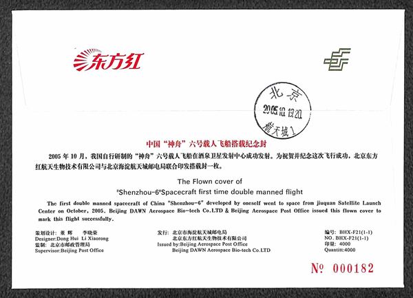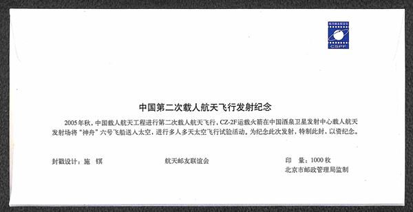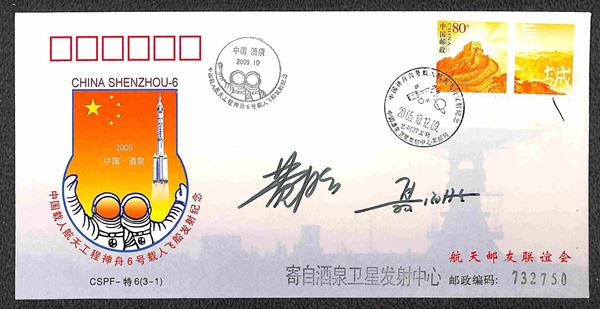 2005 - Shenzhou-6 - cosmogramma ufficiale del secondo volo umano cinese (12-16.10.2005) con due astronauti, il comandante Fei Junlong e il pilota Nie Haisheng - busta volata n.000182 di 200 (n.000001-000200), emessa dal "Beijing Aerospace Post Office" con bollo a secco dell'ufficio notarile e al verso data 19.10.2005 - allegata anche busta commemorativa emessa dal JSLC (centro di lancio satelliti di Jiuquan) con le firme autografe dell'equipaggio Fei Junlong e Nie Haisheng – rara e di ottima qualità - cert. notarile in cinese