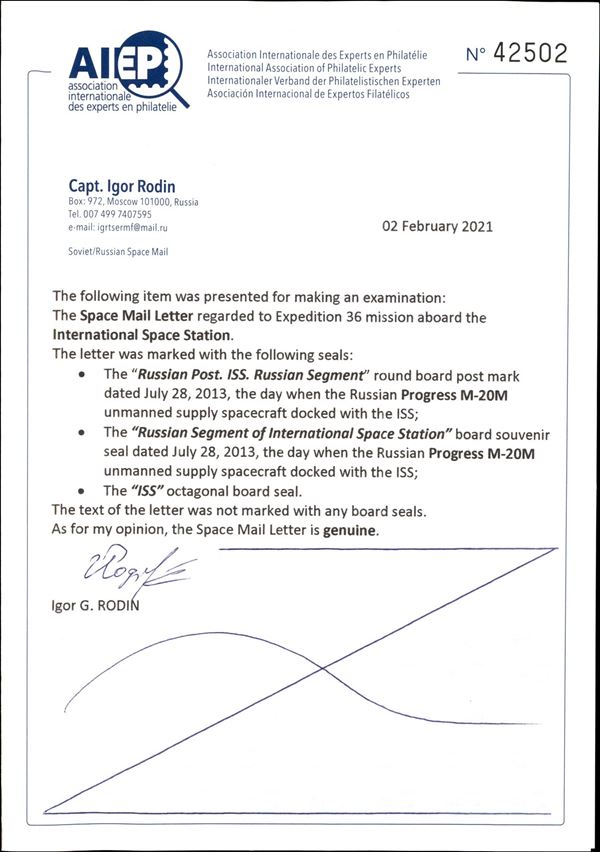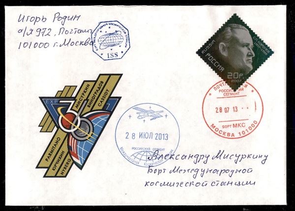 2013 - Progress M-20 - spedizione 36 - posta privata Terra-spazio - cosmogramma indirizzato al comandante A. Misurkin annullato con ottagonale ISS + annulli russi - lettera con annulli di bordo molto bella e di ottima qualità - cert. Rodin