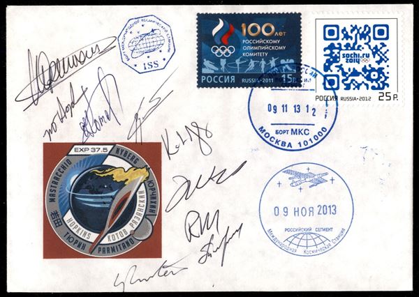 2013 - Soyuz TMA-11 - cosmogramma della prima passeggiata spaziale della torcia olimpica delle Olimpiadi invernali di Sochi 2014 - cosmogramma timbrato con gli annulli di bordo e autografata da tutti i 9 membri dell'equipaggio ISS F.Yurchikhin (Russia), K.Nyberg (USA), Luca Parmitano (Italia), O.Kotov, S.Ryazansky (Russia) e M.Hopkins (USA), M.Tyurin (Russia), R.Mastracchio (USA) e K.Wakata (Giappone) - la torcia è tornata sulla Terra l'11.11.2013, a bordo della Soyuz TMA-09M – molto bella, di ottima qualità e di interesse storico