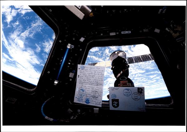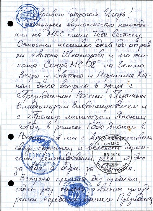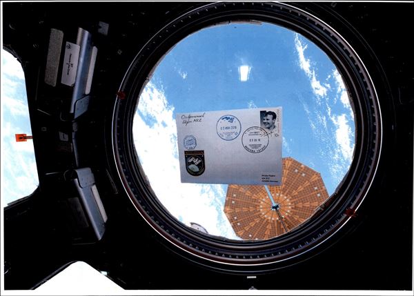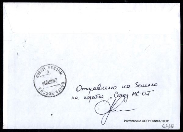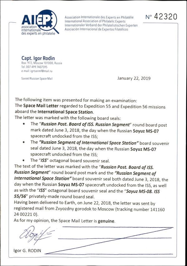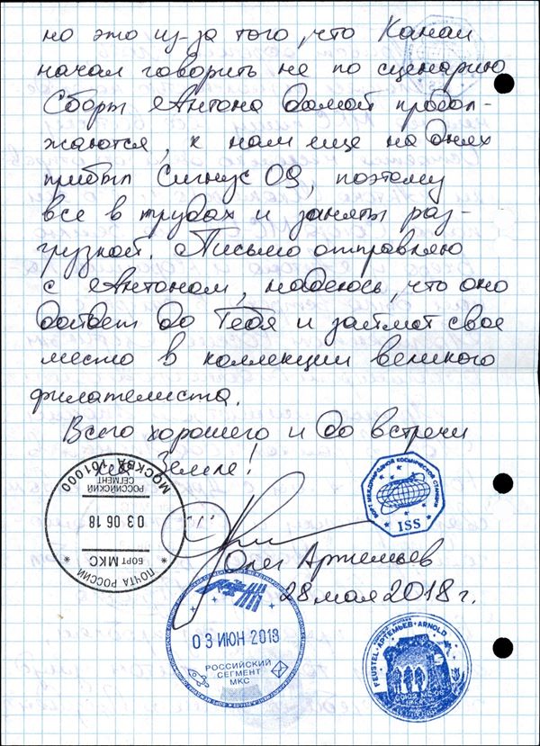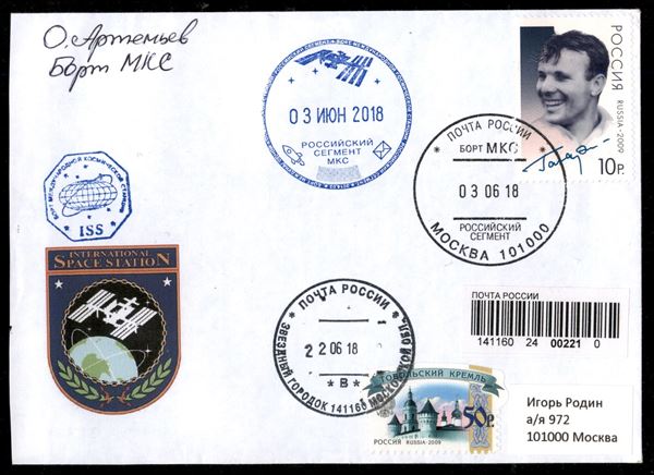 2018 - Soyuz MS-07 - Spedizioni 55/56 - Spazio-Terra – cosmogramma spedito dalla Stazione Spaziale Internazionale alla Terra a bordo della Soyuz MS- 07 - lettera manoscritta dal cosmonauta russo O.Artemyev - lettera e testo (fronte e retro) furono timbrati con gli annulli di bordo + un timbro privato "Soyuz MS-08. ISS 55/56" - al verso della busta dicitura manoscritta "Soyuz MS-07" e firma autografa di O.Artemyev - dopo la consegna a Terra, la lettera fu inviata per raccomandata il 22.6.2018 al suo destinatario dal Centro di addestramento cosmonauti russo, al verso bollo di arrivo del 24.6.2018 – molto bella e di ottima qualità - foto di autenticità dallo spazio - cert. Rodin