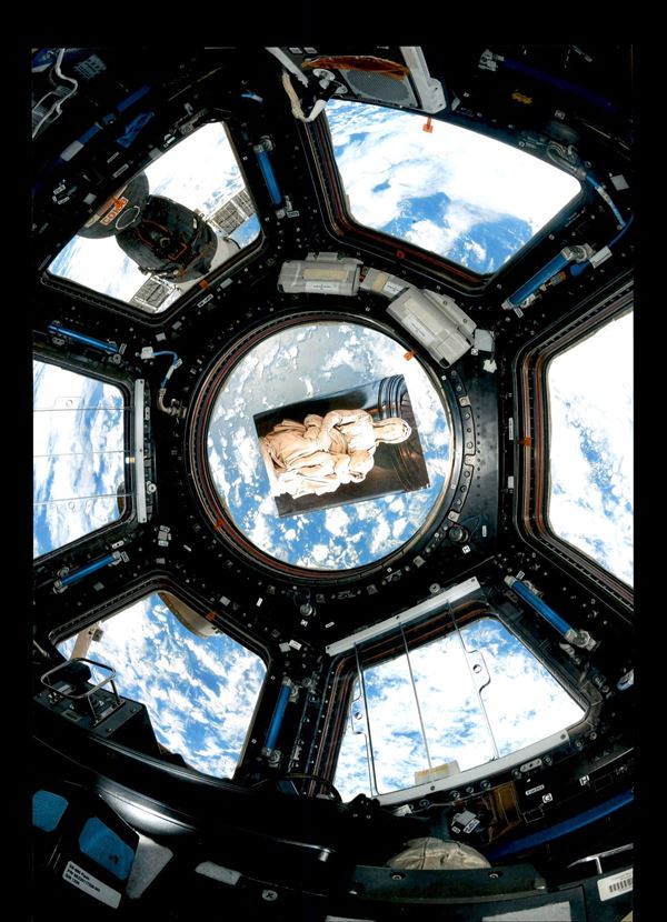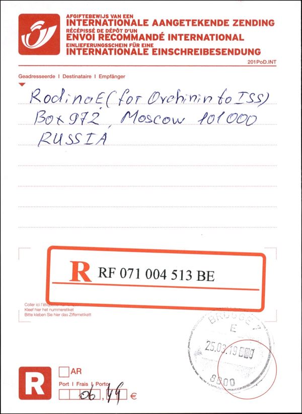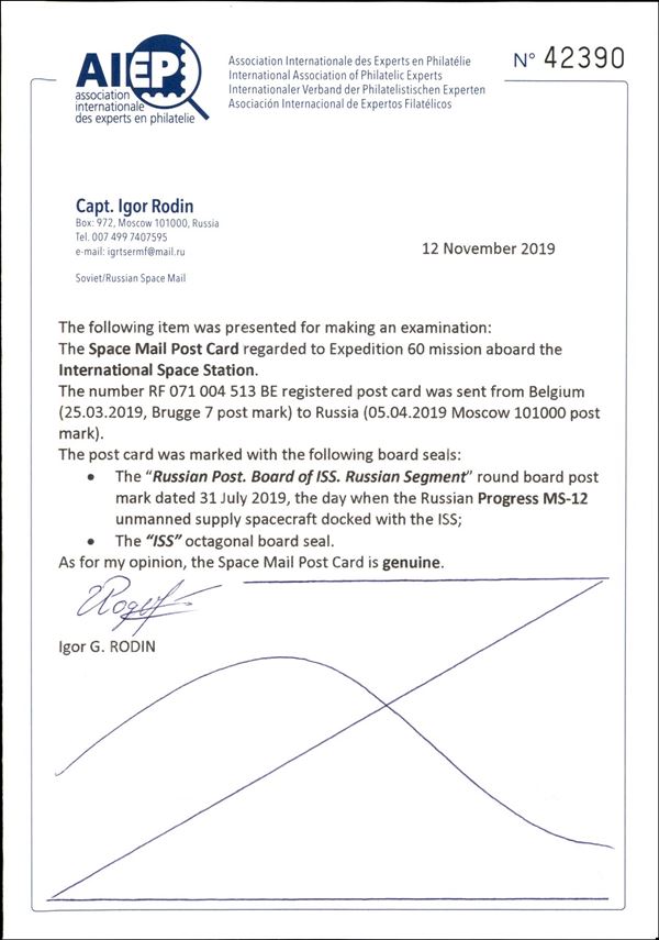 2019 - Progress MS-12 - Terra/Spazio - cartolina spedita dalla Terra alla Stazione Spaziale Internazionale a bordo della navicella di rifornimento senza equipaggio Progress MS-12 - prima la cartolina fu spedita da Bruges (Belgio) per raccomandata in Russia poi a bordo della ISS - la cartolina è timbrata con gli annulli di bordo - ottima qualità - foto di autenticità dallo spazio - cert. Rodin