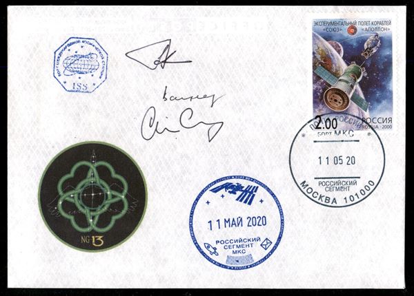 2020 - Cygnus NG-13 - cosmogramma timbrato con gli annulli di bordo datati 11.05.2020, giorno del distacco della navicella di rifornimento senza equipaggio americana Cygnus NG-13 dalla ISS - firme autografe dei 3 astronauti (Soyuz MS-16) a bordo della ISS l'H.05.2020: C.Cassidy (USA); A.lvanishin e I.Vagner (Russia) - ottima qualità