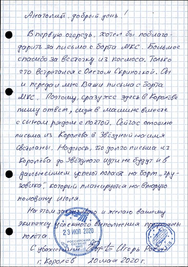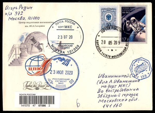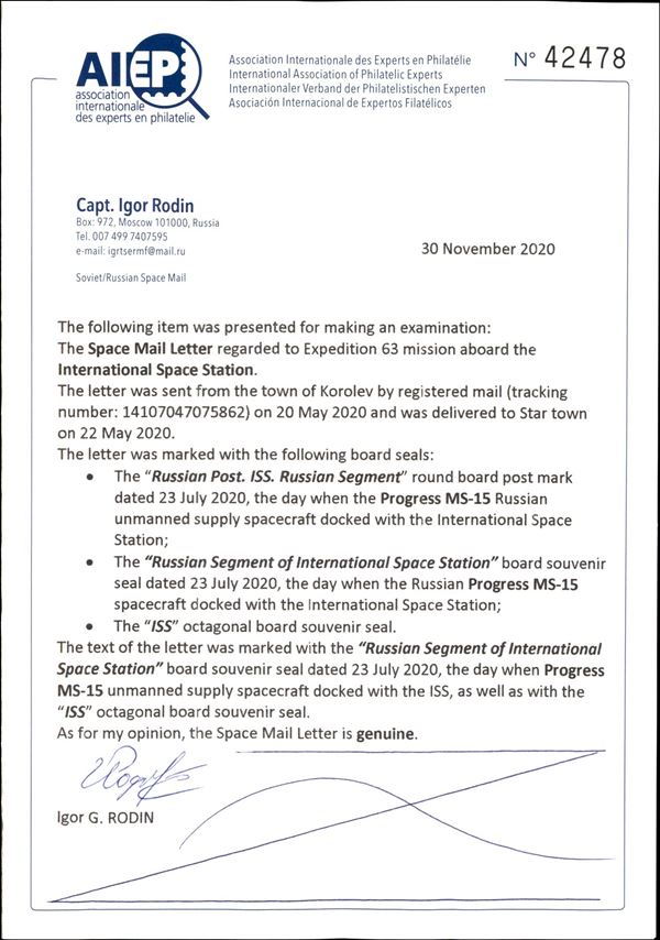 2020 - Progress MS-15 - Spedizione 63 - Terra-Spazio – cosmogramma spedito dalla Terra alla Stazione Spaziale Internazionale a bordo della navicella di rifornimento senza equipaggio Progress MS-15 - prima la lettera fu spedita da Korolev (Russian Mission Control Center) a Zvyozdny Gorodok (Star town, Russian Cosmonaut Training Center) il 20.5.2020 poi a bordo della ISS - lettera timbrata con gli annulli di bordo – molto bella e di ottima qualità - foto di autenticità dallo spazio - cert. Rodin