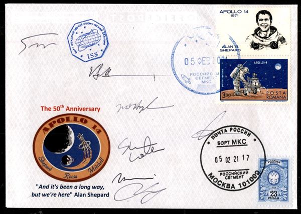 2021 - Busta commemorativa 50° anniversario Apollo 14 - cosmogramma annullato dalla ISS il 05.02.21 (in ricordo del giorno dell'allunaggio) - firme dei 7 astronauti a bordo - ottima qualità