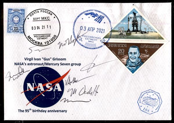 2021 - Spedizione 64 - cosmogramma del 95° anniversario dell'astronauta Grissom annullato sulla Stazione Spaziale Internazionale il 3.4.21 - firme autografe di 7 astronauti M. Hopkins V. Golver S. Walker S. Noguchi S. Ryzhikov S. Kud-Sverchkov e K. Rubins - ottima qualità