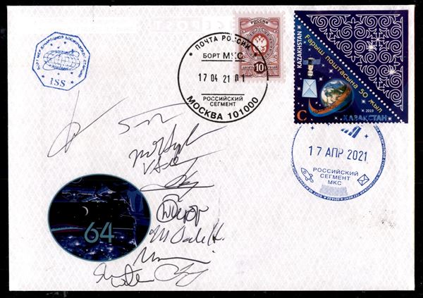 2021 - Spedizione 64 - distacco Soyuz MS - 17/155 - cosmogramma con l'emblema della missione annullato sulla Stazione Spaziale il 17.4.21 - firme autografe dei 10 astronauti da 3 missioni diverse M. Hopkins V. Glover S. Walker S. Noguchi S. Ryzhikov S. Kud-Sverchkov K. Rubins O. Novickiy P. Dubrov e M. Vande Hei - molto bella e di ottima qualità