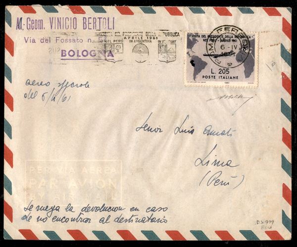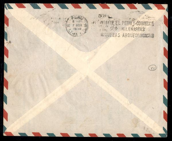 Aerogramma affrancato con Gronchi Rosa ricoperto dal lilla (920/921) - bollo di arrivo a Lima - Bolaffi + ED