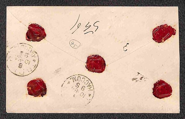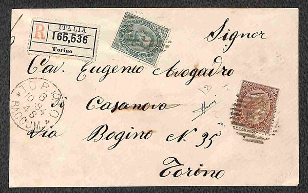 Affrancatura mista due Re, busta raccomandata da TORINO 6.10.84 per cittą con V.E.II c.30 bruno castano + Umberto c.5 verde (19 + 37) annullati con numerale a sbarre, firme E.D. e Sorani