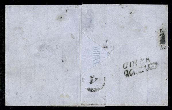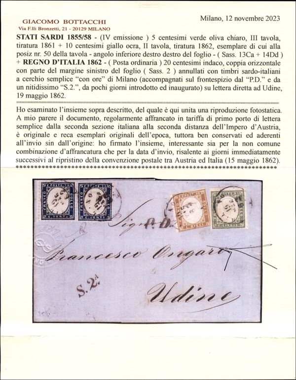 Affrancatura mista Sardegna c.5 verde oliva chiaro + c.10 giallo ocra (13Ca + 14Dd) + Regno coppia c.20 indaco (2) da MILANO 19 MAR.62 per Udine con a lato bollo P.D. nero e S.2a in esatta tariffa dalla seconda sezione italiana alla seconda sezione austriaca, cert. G.Bottacchi