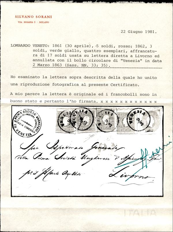 Bella lettera affrancata con s.5 rosso + quattro esemplari s.3 verde (33+35) da VENEZIA 9/3 del 1863 per Livorno, con a lato il bollo "Prima Società Ungherese Assicurazioni Generali - Agenzia Generale in Venezia", rara combinazione, cert. Sorani