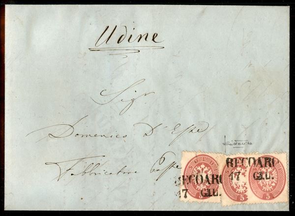 Bellissima lettera da Recoaro SD (P.ti 5) affrancata con tre esemplari del 5 soldi (38) applicati sovrapposti (treppenfrankatur) - rara disposizione nel Lombardo Veneto - Sottoriva