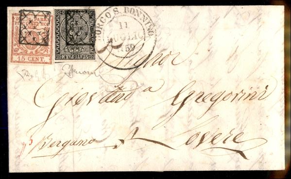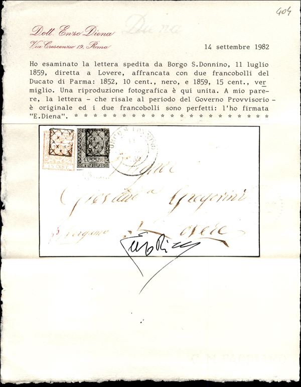 Borgo S. Donnino 11 luglio 1859 (C2) - lettera affrancata con 10 + 15 cent (2 + 9) annullati con griglietta - splendida letterina in periodo di Governo Provvisorio - molto rara - ED + Grioni + cert. ED