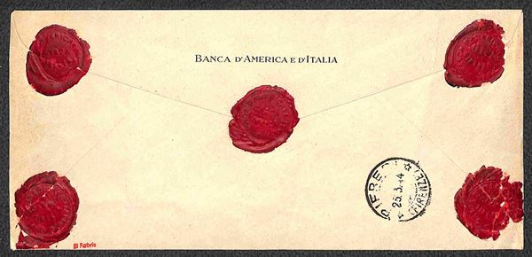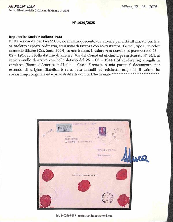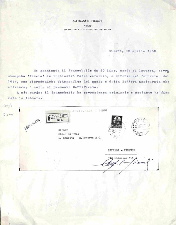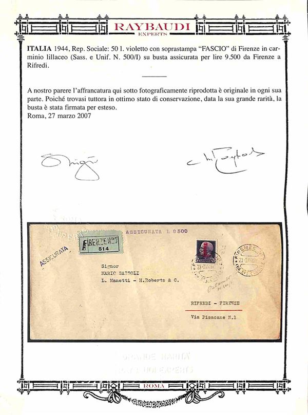 Busta assicurata per 9500 lire della Banca d'America e d'Italia affrancata con 50 lire fascio carminio lillaceo (500/I) emissione di Firenze in uso isolato - busta per cittą Firenze 23.3.44 - molto bella rara e di ottima qualitą - cert. Fiecchi + cert. oro Raybaudi + cert. Andreoni