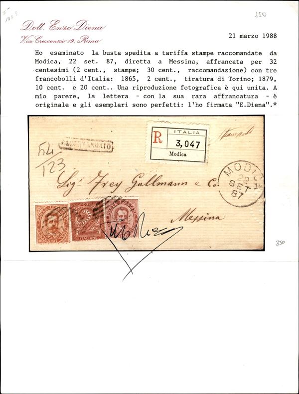 Busta per stampe raccomandate da Modica 22.9.87 affrancata con mista tricolore due Re (38 + T15 + 39) - rara - ex coll. Provera - cert. ED