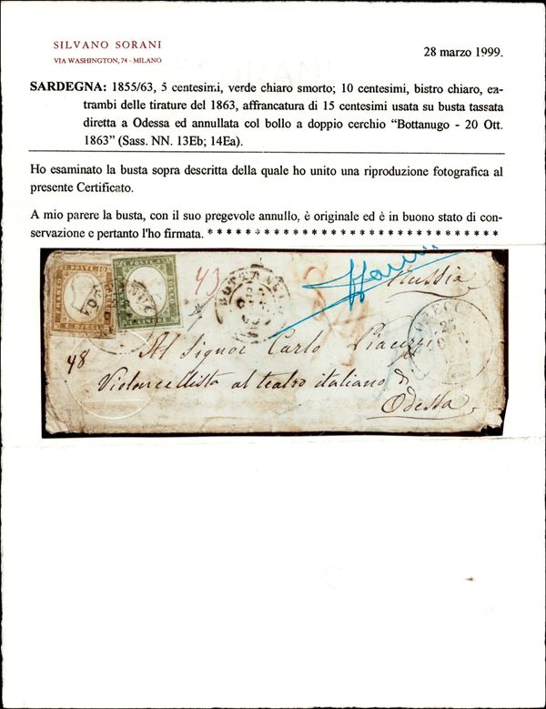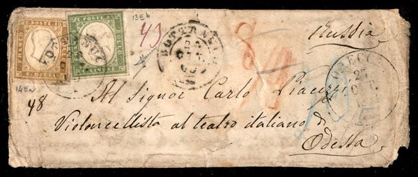 Bustina per la Russia affrancata con c.5 verde chiaro smorto + c.10 bistro (13Eb+14) da BOTTANUCO 24 OTT.63 diretta ad Odessa con vari segni di tassa, cert. S.Sorani. Non di qualità ma estremamente rara