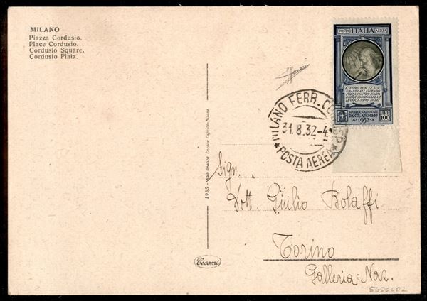 Cartolina affrancata con 100 lire Aerea Dante bordo di foglio (A41) - Milano posta aerea 31.8.32 - rara - Sorani