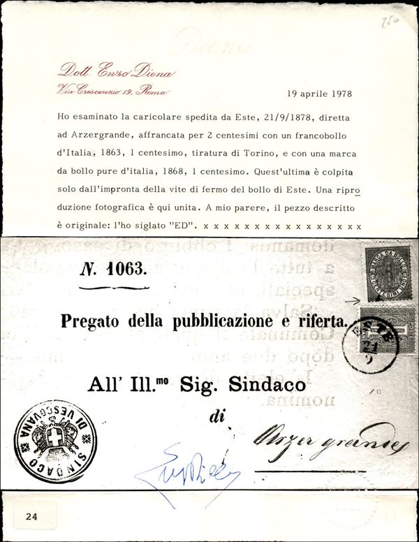 Circolare affrancata con 1 cent DLR (L14) affrancato da Marca da Bollo da 1 cent da Este a Arzergrande del 21.9.78 - francobollo annullato con bollo austriaco e marca colpita da vite di ferro del bollo postale - cert. E. Diena