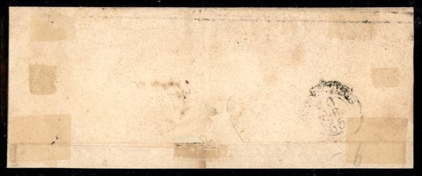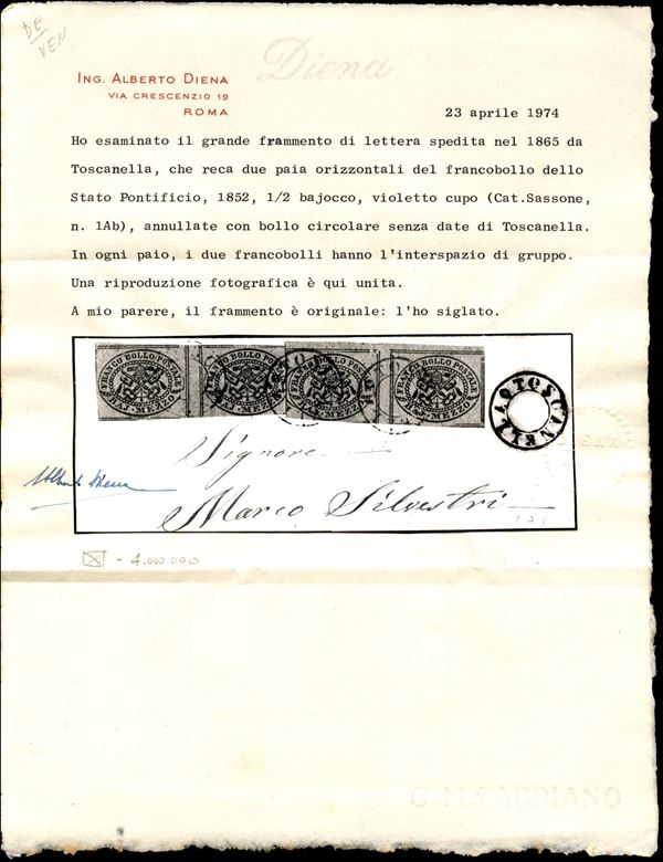 Due coppie orizzontali con interspazio di gruppo del 1/2 baj violetto cupo (1Ab) su grande frammento di lettera da Toscanella (circolare senza data) - margini completi - cert. A. Diena