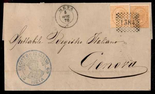 Due esemplari c.10 tiratura di Torino in tinte annullati con nitido numerale a punti 1384 su lettera da META 8 apr.76 A Genova