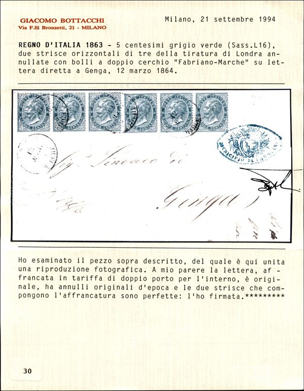 Due strisce orizzontali di tre del 5 cent DLR (L16) su lettera da Fabriano a Genga del 12.3.64 - cert. Bottacchi