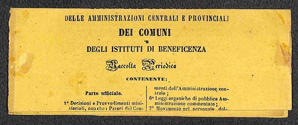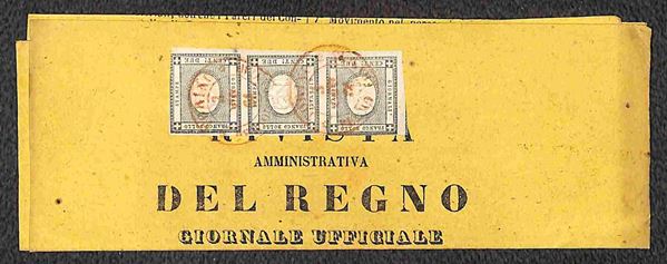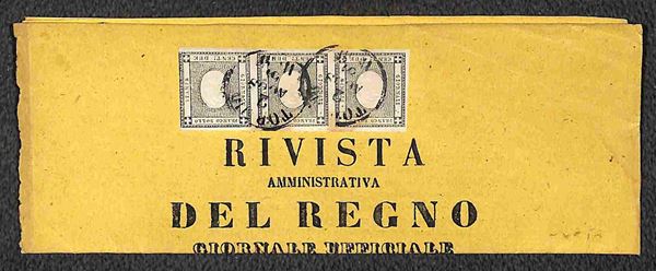 Due testate della "Rivista Amministrativa del Reno" affrancate con striscia di tre c.2 grigio con annulli di TORINO 2 AGOS.61 e TORINO PERIOD. FRANCHI 3 FEB.61 in rosso
