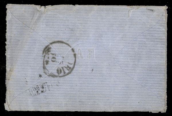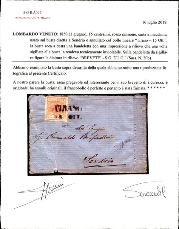 Eccezionale busta inviolabile da Torino (SD - P.ti 6) affrancata con 15 cent (20b) ben marginato - sulla bandelletta laterale dicitura in rilievo "Brevetè S.G. DV G. - rarissima - cert. Sorani