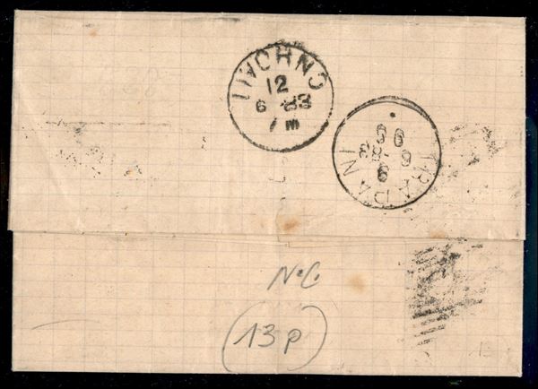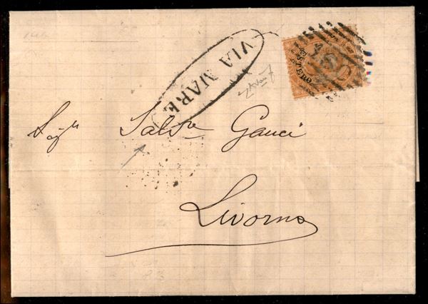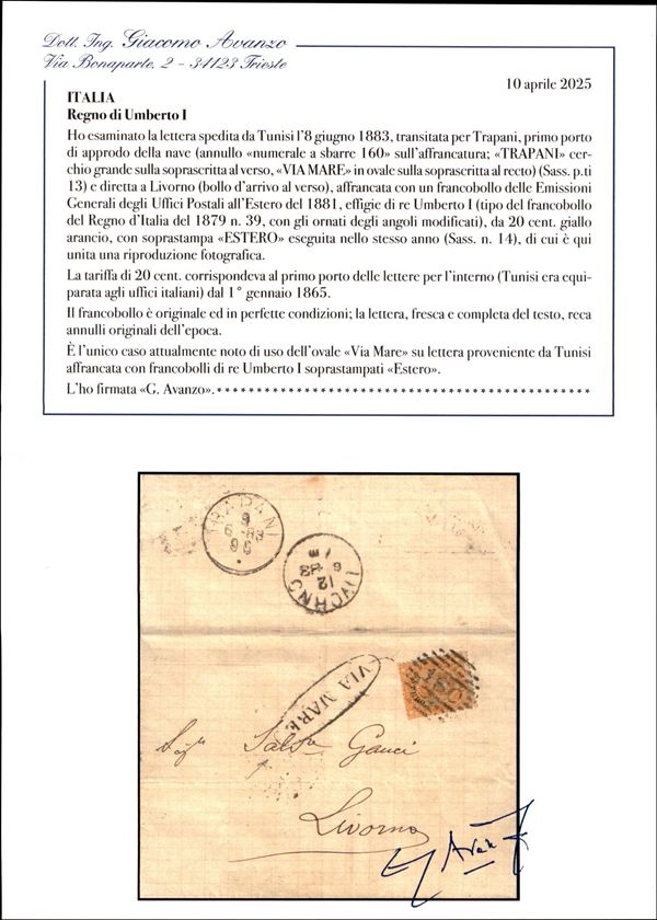 Fresca lettera da Tunisi per Livorno affrancata con 20 cent (14) ben dentellato annullato con numerale a sbarre 160 di Trapani e Via Mare in ovale a lato (P.ti 13) - insieme unico di particolare bellezza - cert. Avanzo