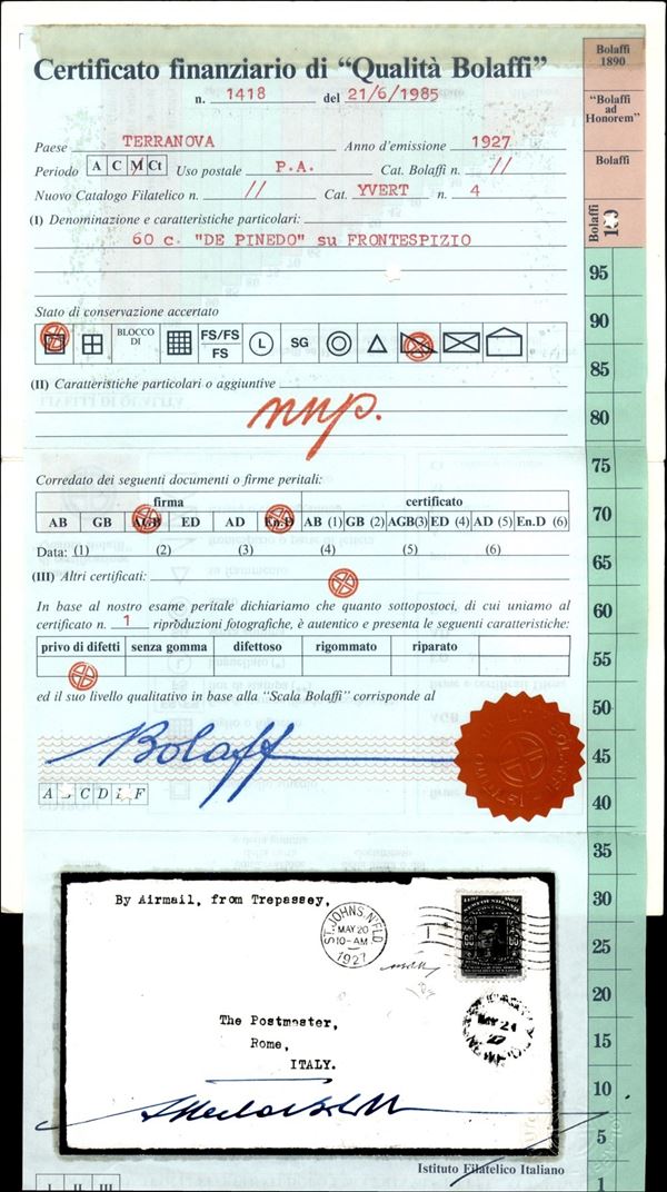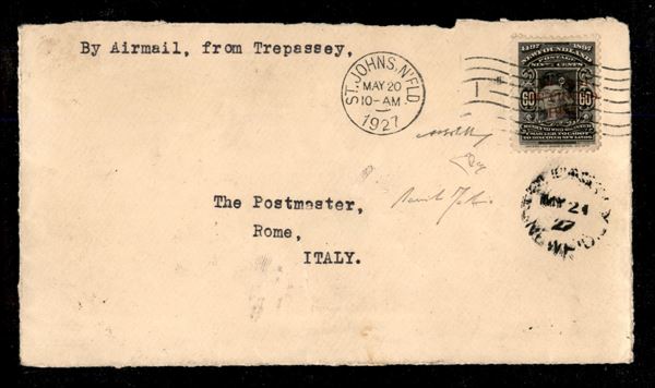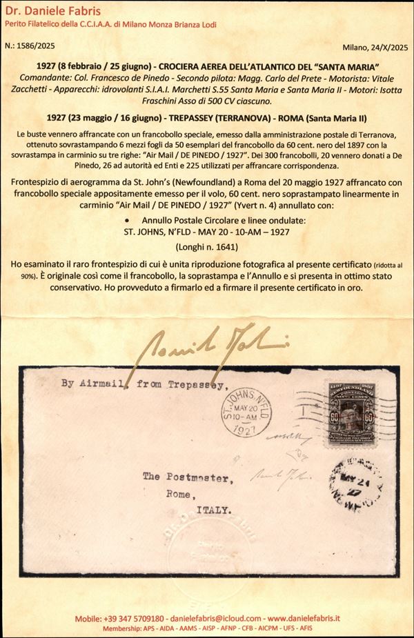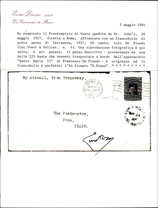 Frontespizio di busta della Crociera dell'Atlantico del Santa Maria del Colonnello Francesco De Pinedo 8.2/25.6 1927 (Longhi 1641) - esemplare del 60 cent soprastampato (Yvert 4) annullato con timbro meccanico St. Johns Ntld 20.5.27 + timbro Trepassey del 21.5.27 su busta - molto bello e raro - cert. finanziario Bolaffi 100% + cert. E. Diena + cert. oro Fabris
