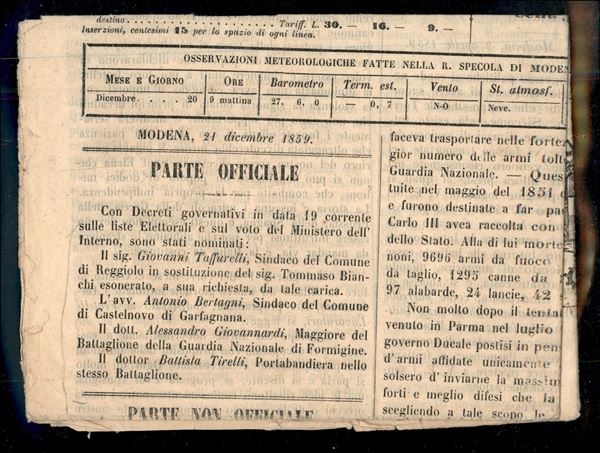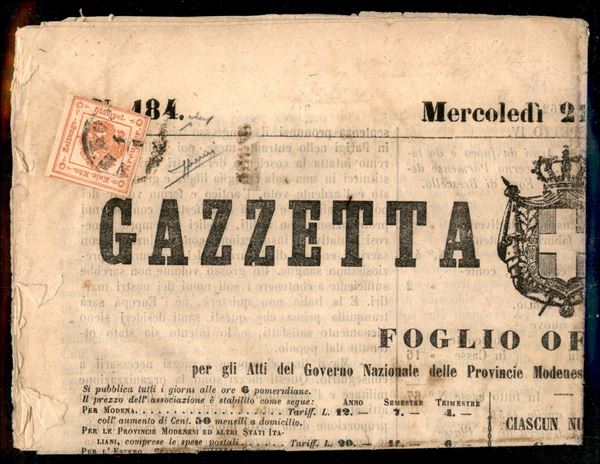 Giornale "GAZZETTA DI MODENA" del 21 dicembre 1859 con segnatasse k.2 vermiglio (SG 2) annullato a VERONA 1/1, firma Chiavarello, S.Sorani