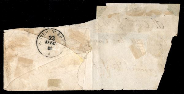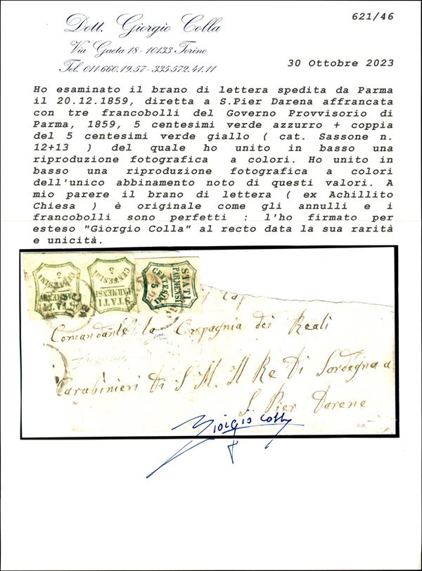 Grande frammento di lettera affrancata con coppia del 5 cent verde giallo (13) in combinazione con il 5 cent verde azzurro (12) tutti ben marginati da Parma a S. Pier d'Arena del 20.12.59 - trattasi dell'unico documento postale noto con questa combinazione di valori gemelli - ex collezione Achillito Chiesa - ED + cert. Colla