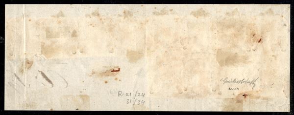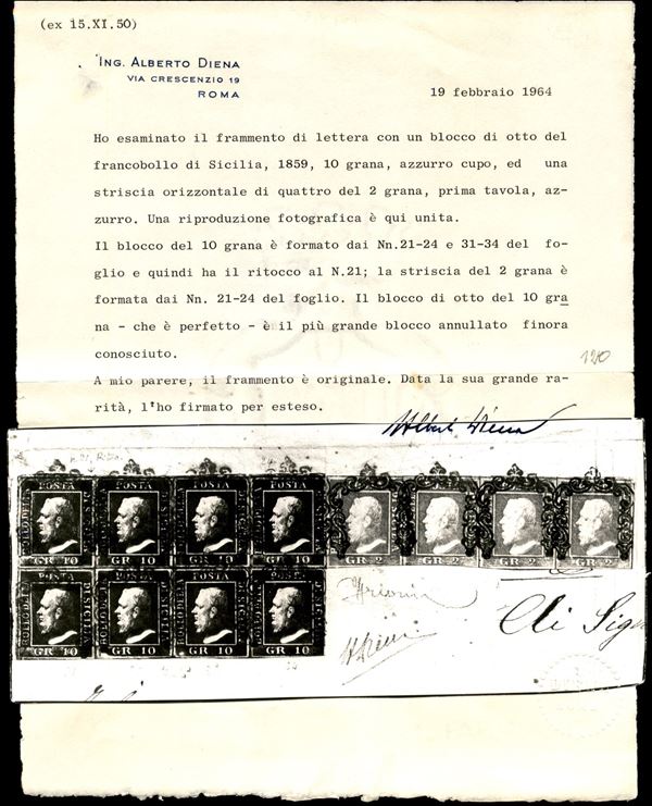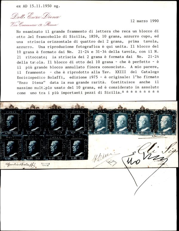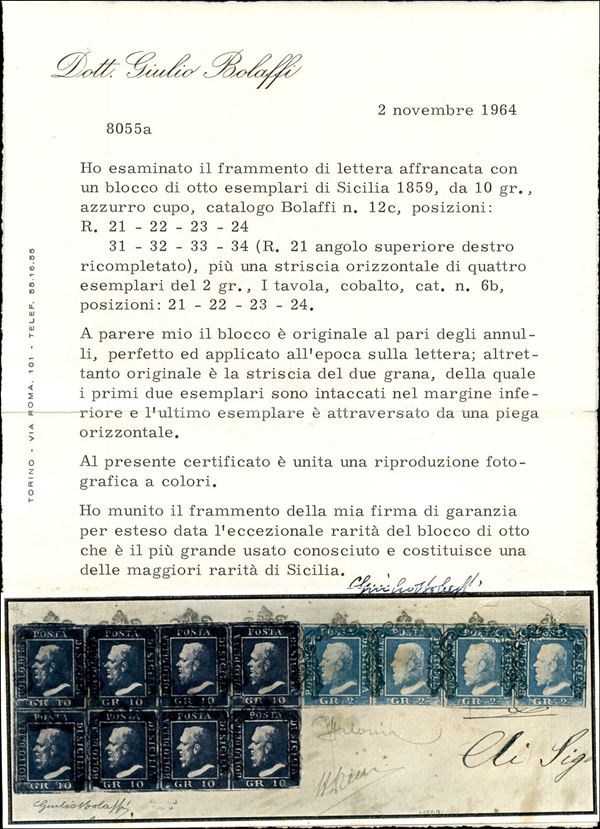 Grande frammento di lettera con striscia orizzontale di quattro gr.2 azzurro, prima tavola + blocco di otto del gr.10 azzurro cupo, si tratta del più grande blocco usato ad oggi conosciuto, riprodotto alla Tav XXIII del Catalogo Enciclopedico Bolaffi. Si tratta certamente di una delle massime rarità note della collezione di Sicilia. Cert. A.Diena, E.Diena, Giulio Bolaffi.