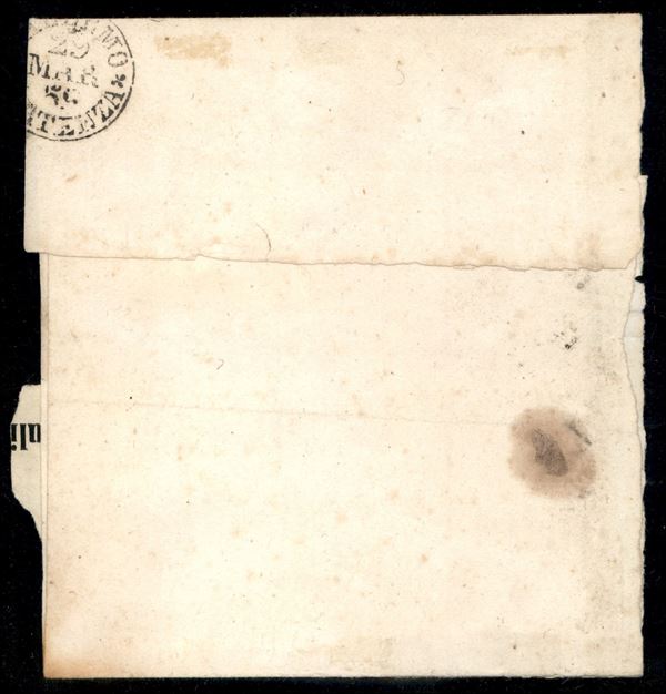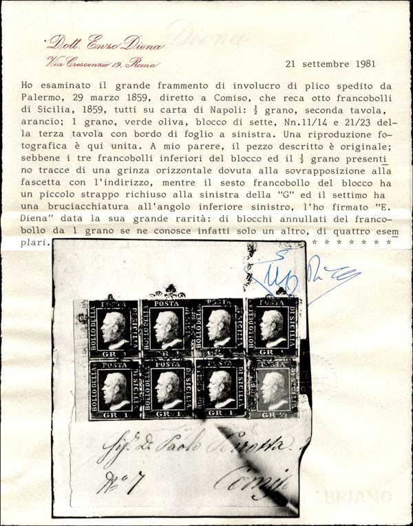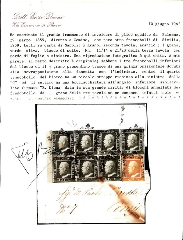 Grande frammento di lettera diretta a Comiso affrancato con blocco di sette del gr.1 verde oliva, terza tavola, pos 11/14 e 21/23 con ampio bordo di foglio a sinistra + gr.1/2 arancio, seconda tavola (2, 5d), cert. A.Diena ed E.Diena. Si tratta certamente di una delle massime rarità note della collezione di Sicilia
