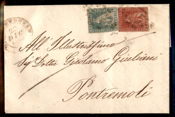 Lettera affrancata con cr.1 carminio + cr.2 verde grigio giallastro (12 + 13b) annullati col muto a rombi di MONTEPULCIANO 23 DIC.59 per Pontremoli, insieme interessante, firma Chiavarello