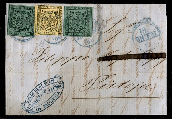 Lettera con affrancatura a bandiera c.15 giallo + due esemplari c.5 verde (3+7) da MODENA 19 DICEM.1857 per Pistoia