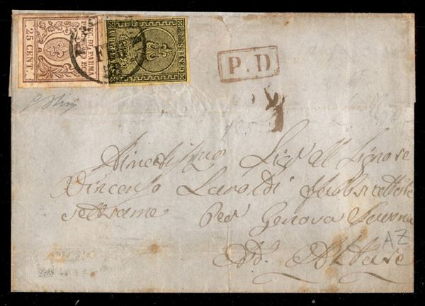 Lettera con affrancatura mista c.5 giallo + c.25 bruno lilla (1+10) da PIACENZA 5 FEB.58 con bollo in cartella rossa P.D. per Altare