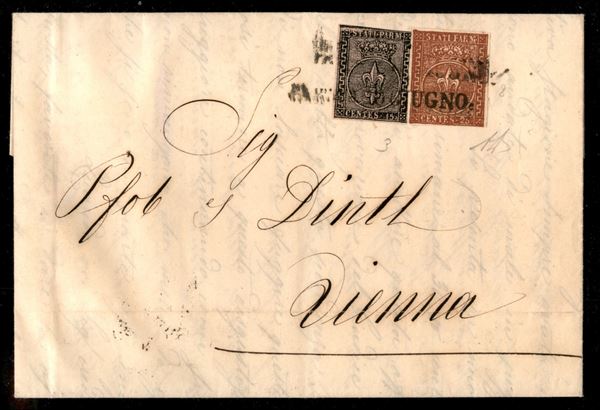 Lettera con c.15 rosa prima emissione + c.25 bruno rosso (3+8) da PARMA 10 GIUGNO del 1856 per Vienna, difetti di marginatura per il 15 centesimi ma insieme di ottimo aspetto e grande freschezza, firma A.D.