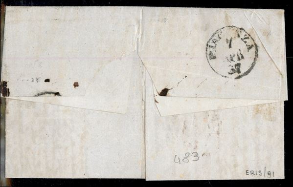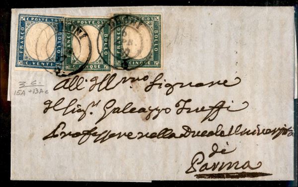 Lettera con coppia c.5 verde smeraldo + c.20 cobalto (13d + 15da) BRONI 26.APR.57 per Parma, insieme molto fresco