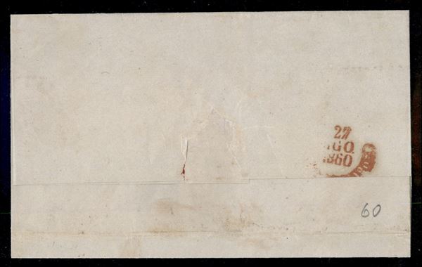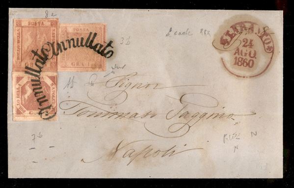 Lettera con gr.1 rosa I tavola + gr.2 rosa chiaro III tavola + gr.5 rosa chiaro I tavola (3b+7b+8c) annullati con bollo a svolazzo e a lato il cerchio rosso di TRAPANI 24 AGO.1860 per Napoli, firma A.D.; Palermo; Chiavarello