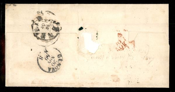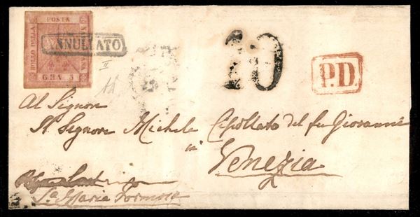 Lettera con gr.5 carminio rosa (9) II tavola con bollo ANNULLATO in cartella da NAPOLI 16 NOV.1860, periodo luogotenenziale, diretta a Venezia con a lato il bollo PD in cartella rossa e segno di tassa a tampone dei 10 kreuzer