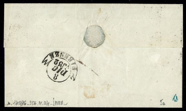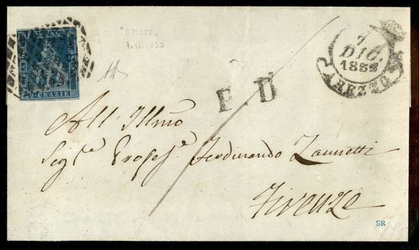 Lettera da Arezzo 7.12.52 affrancata con 2 crazie (5a) con margini bianchi - annullo muto a rombi (P.ti 9) - ex coll. Provera - AD