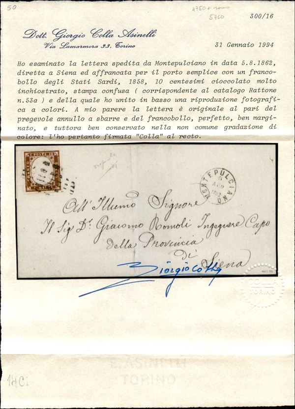 Lettera da Montepulciano 5.8.62 recante 10 cent cioccolato con stampa confusa (14Ci - Rattone 53a) - raro - ex coll. Provera - cert. Colla