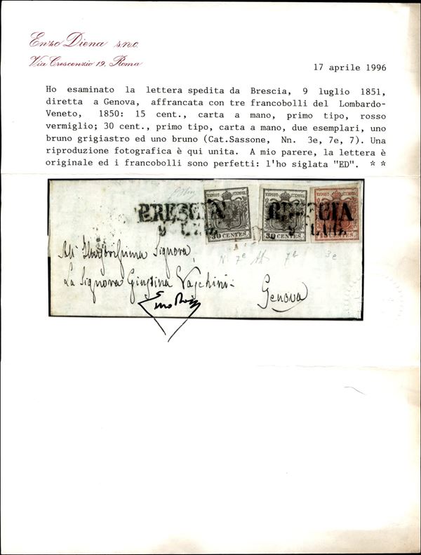 Lettera di piccolo formato con c.15 rosso vermiglio + due esemplari c.30 bruno I Tipo, di colori differenti (3e, 7, 7e) da BRESCIA 9 LUG. a Genova, interessante