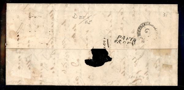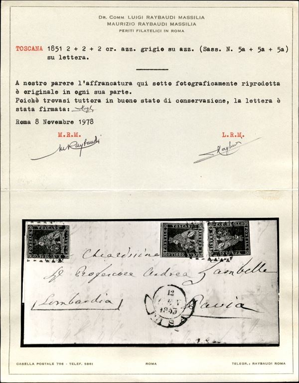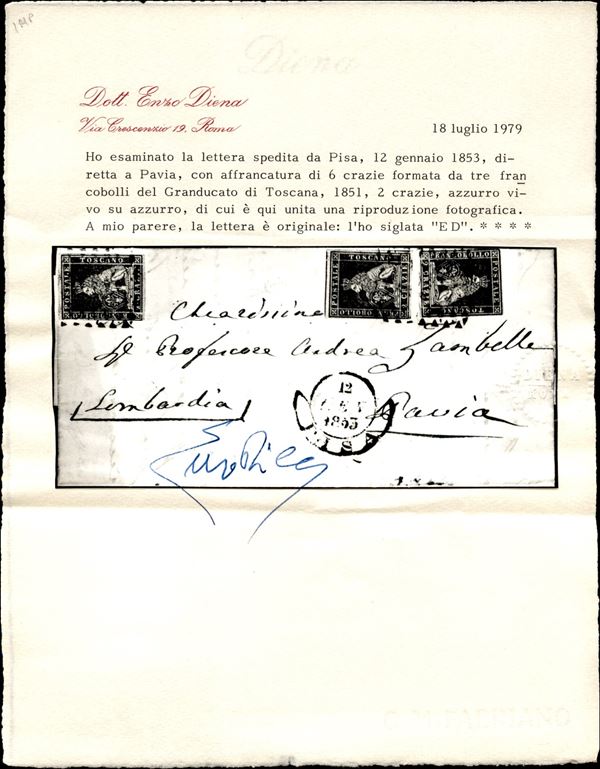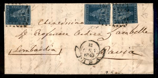 Lettera triplo porto per il Lombardo Veneto affrancata con tre esemplari cr.6 azzurro scuro su azzurro (7c) annullati con bollo muto a rombi di PISA 12 GEN.1853 per Pavia, cert. L.Raybaudi