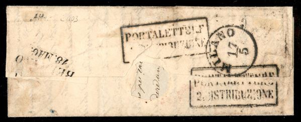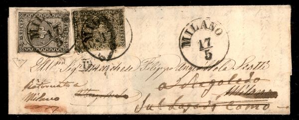 Letterina spedita da Piacenza 16.3.55 affrancata con 10 cent pił 5 cent Parma (2 + 1b) ben marginati e annullati con DC - giunta a Milano previa nuova obliterazione con bollo in CS viene fatta proseguire per Rogoledo (Belluno) e da qui infine rispedita a Milano - raro insieme - cert. ED
